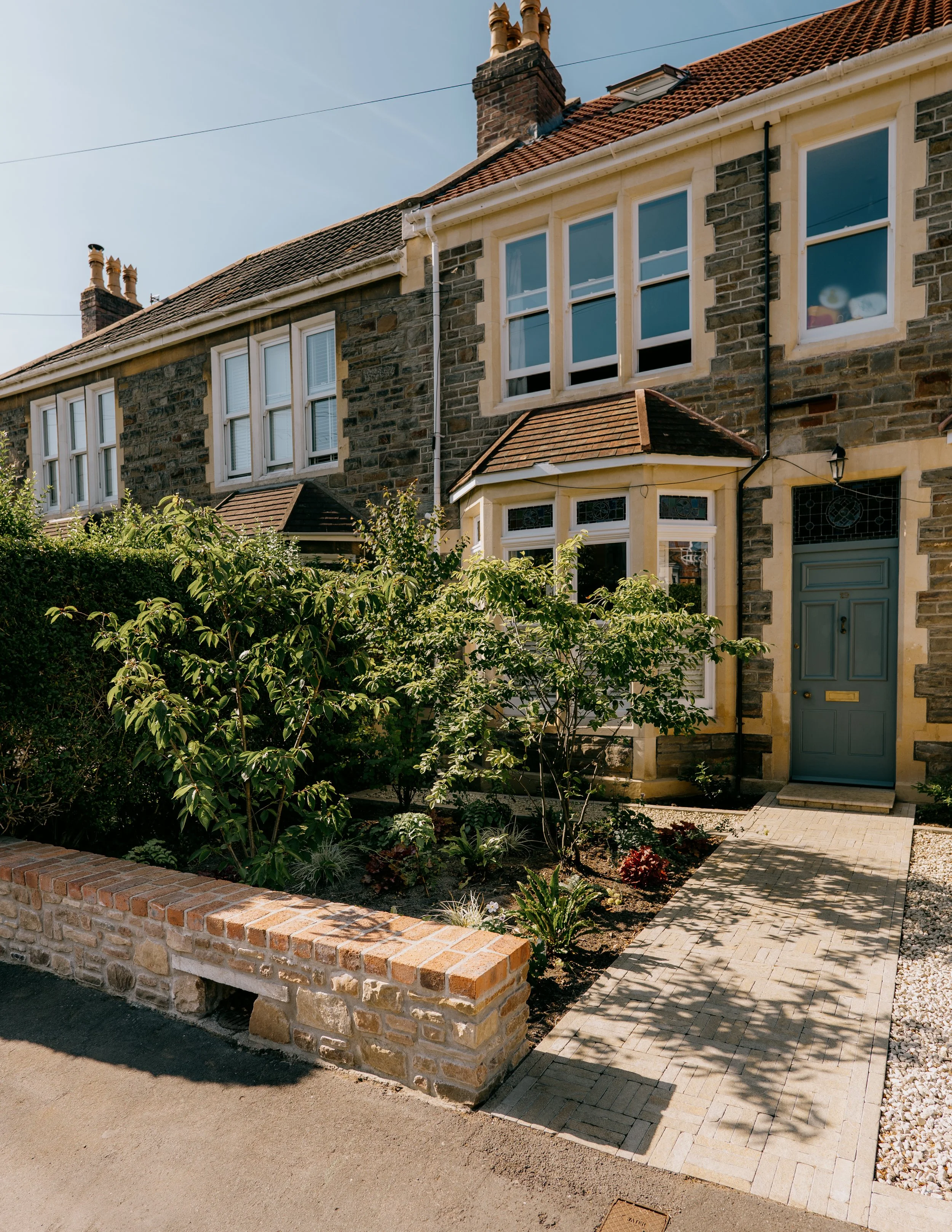 This garden was once a concrete double driveway but with just a few materials it changed into something simple and much more stylish. Antique limestone pavers are arranged in a basket weave pattern that guides you to the front door. A new wall and planting beds help separate the walkway from the house providing some privacy. You can park one big car on the right side gravel with ease.